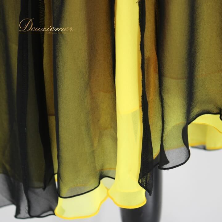 社交ダンス 衣装 スタンダード スカート レッスンウェア パーティー 派手 Sanline サンリーヌ ブラック系 イエロー系 黒 黄色 バイカラー ダンススカート ドレス フィット感 コスチューム イベント用 自宅練習 ボリューム感 おしゃれ ショート丈 動きやすい ハンドメイド 日本製 薄手 生地 通気性 良い 伸縮性 レディース向け 目立つ ステージ衣装