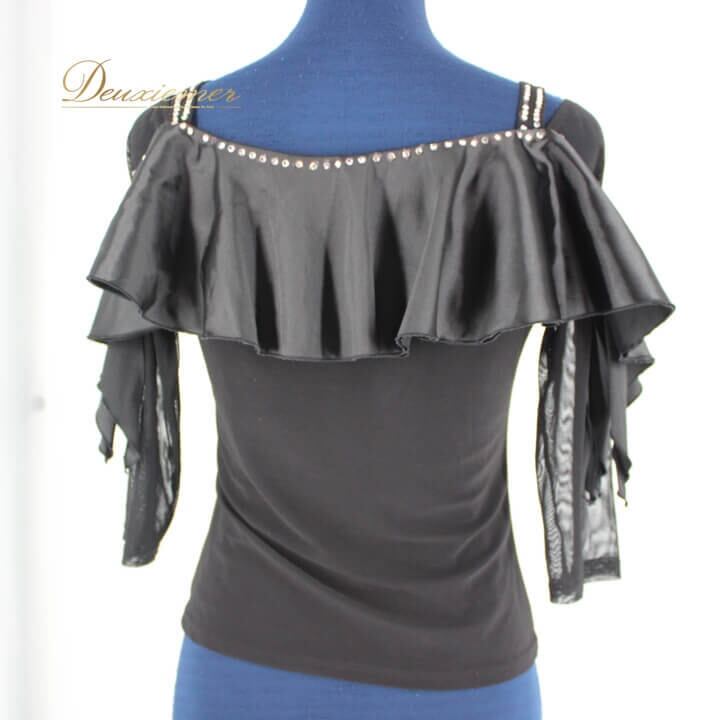 社交ダンス 衣装 スタンダード トップス レッスンウェア パーティー ブラック系 黒 ラインストーン レース 透け感 無地 シンプル デザイン おしゃれ 伸縮性 上品 セクシー パーティー用 講座用 トップスタイリッシュ 薄手 肌見せ 袖あり 袖フリル