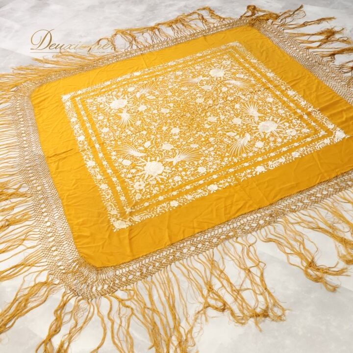フラメンコ 衣装 マントン シージョ スクエア 大判 刺繍 フレコ フリンジ 黄色 マスタード イエロー系 薔薇 ダンス 舞台 踊り 大きなマントン 豪華 豪快 柔らかい ステージ衣装 フラメンコダンス ステージパフォーマンス 伝統文化 パーティ フリンジデザイン バラ 花柄