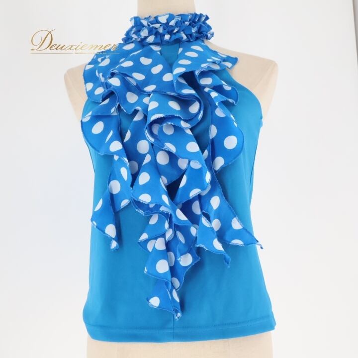 フラメンコ 衣装 トップス ブラウス ノースリーブ ブルー系 青 水色 水玉 ドット フリル レース 袖なし ダンス 舞台 発表会 可愛い 鮮やか ボリューム ダンス衣装 おしゃれ