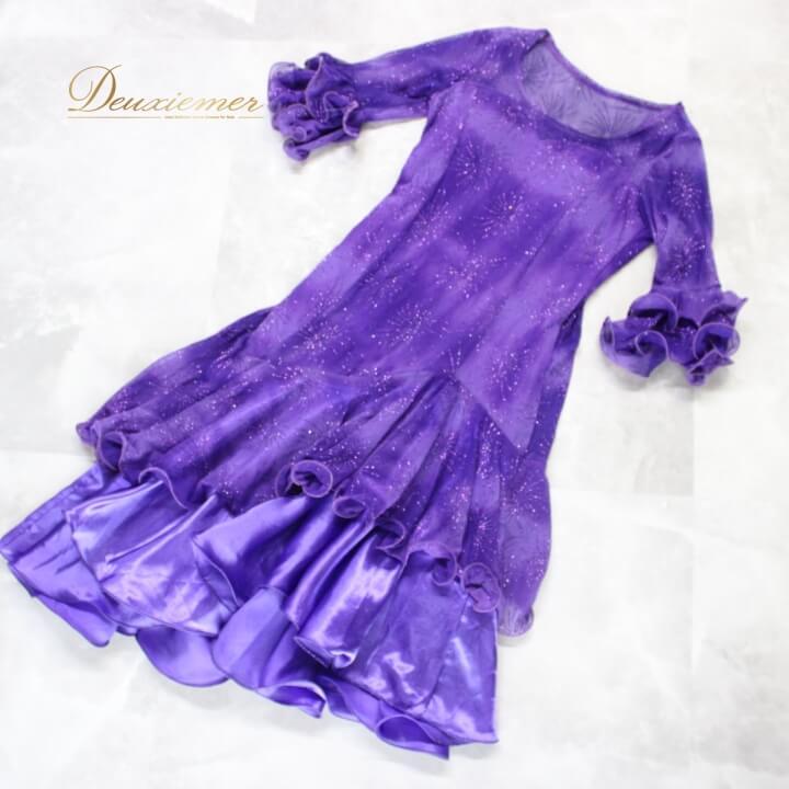社交ダンス 衣装 スタンダード ドレス レッスンウェア パーティー パープル系 紫 フリル アシンメトリー アシメ 派手 目立つ キラキラ ラメ 舞台映え おしゃれ 可愛い フェミニン パーティードレス ダンスウェア リズムダンス アート ダンス衣装