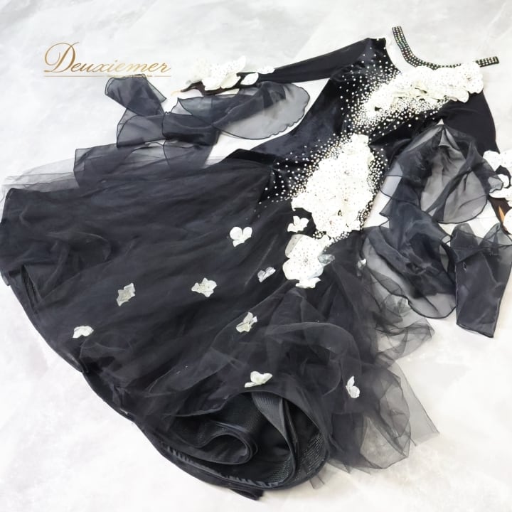 社交ダンス 衣装 スタンダードドレス スタンダード ドレス フロート 黒 白 花 ベロア ブラック系 高級感 デモ 競技 スカート 花飾り 華やか 競技用 パーティー ドレス 大人用 上品 デザイン パフォーマンス パフォーマンス衣装