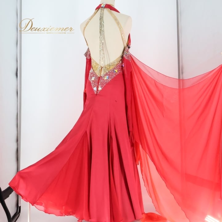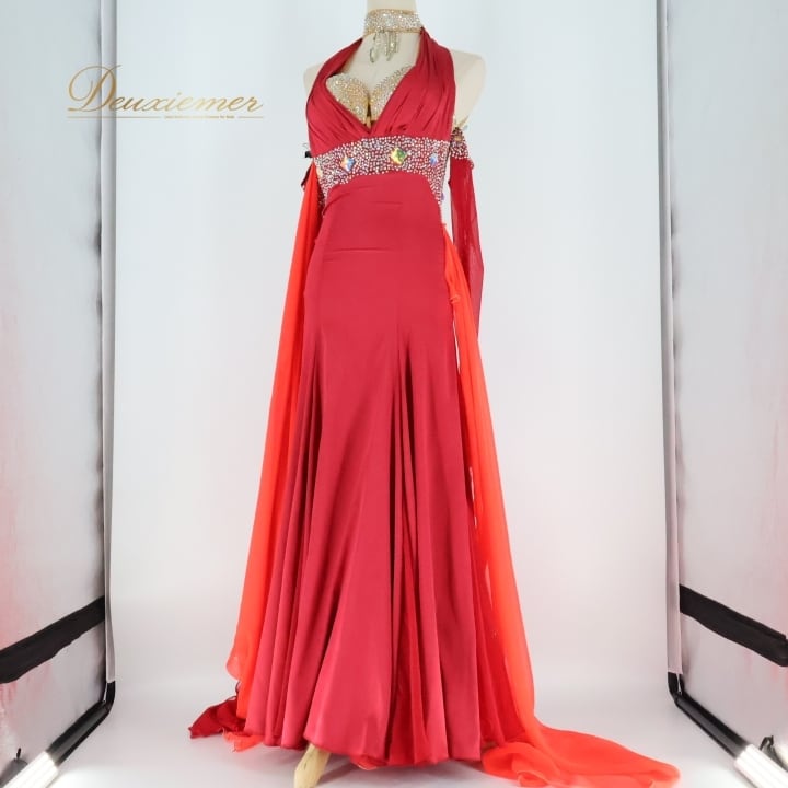 #社交ダンス #ダンス衣装 #ワンピース #ドレス #レオタード #ファスナー #大人の女性 #赤色 #オレンジ #セクシー #ダンスファッション #スカート #三重仕立て #胸パッド #伸縮性 #トルソー #ダンススタイル #フォーマル #ダンスパーティー #ENUTSU