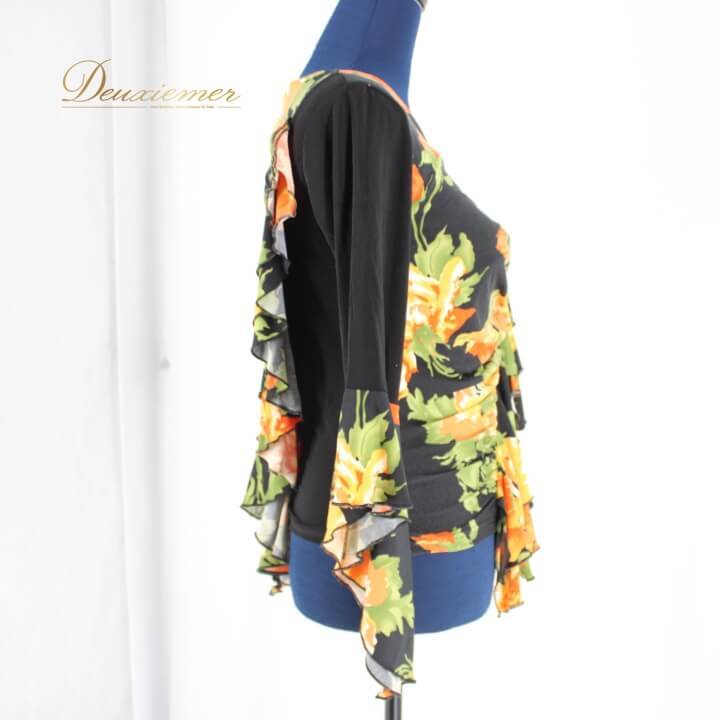 #社交ダンス #ダンス衣装 #花柄 #トップス #ブラック #オレンジ #イエロー #グリーン #ファッション #ダンスウェア #おしゃれ #フィットネス #ダンスパフォーマンス #パーティー #着やすい #伸縮性 #トルソー #コスチューム #アクティブwear #ENUTSU
