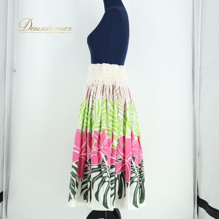 フラダンス 衣装 パウスカート ホワイト系 フラ ダンス ハワイアン 白 緑 黄緑 花柄 モンステラ柄 アロハ シングル 明るい 華やか フラワー ふんわり ハワイアンプリント 鮮やか グリーン系 ピンク系