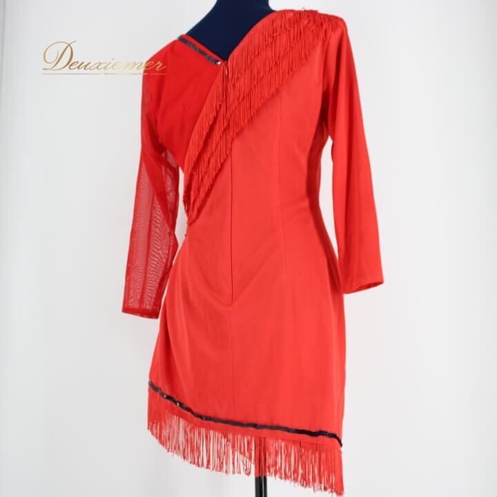 社交ダンス 衣装 ラテン スタンダード ドレス ワンピース パーティードレス レッスンウェア BOUTIQUE MUGEN ブラック系 黒 レッド系 赤 アシンメトリー アシメ 派手 フリンジ フリンジドレス コサージュ 取り外し可能 日本製 バリエーション