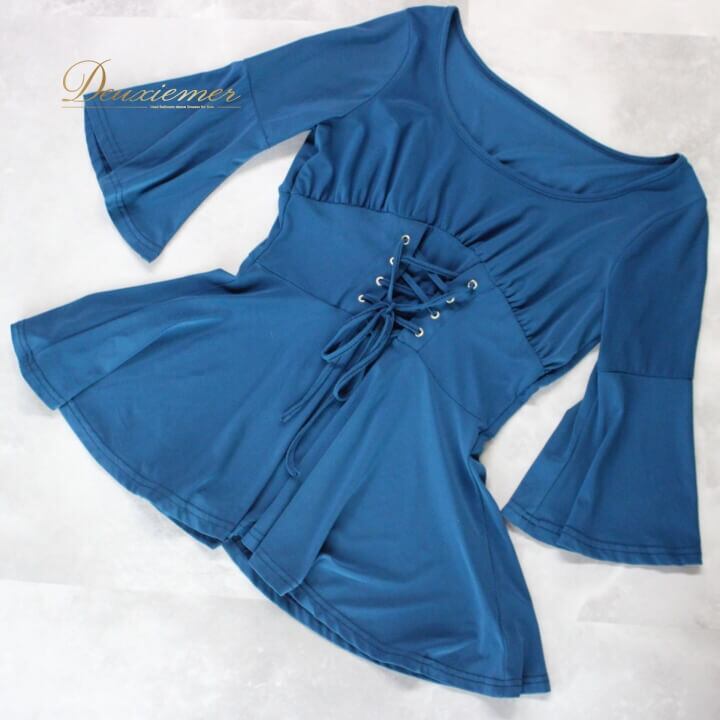 社交ダンス 衣装 スタンダード トップス パーティー レッスンウェア 練習着 Leirena レイリーナ ブルー系 青 長袖 無地 シンプル 編み上げ かわいい フレア ストレッチ ウエストマーク スタイルアップ コバルトブルー かわいいデザイン ダンス練習着