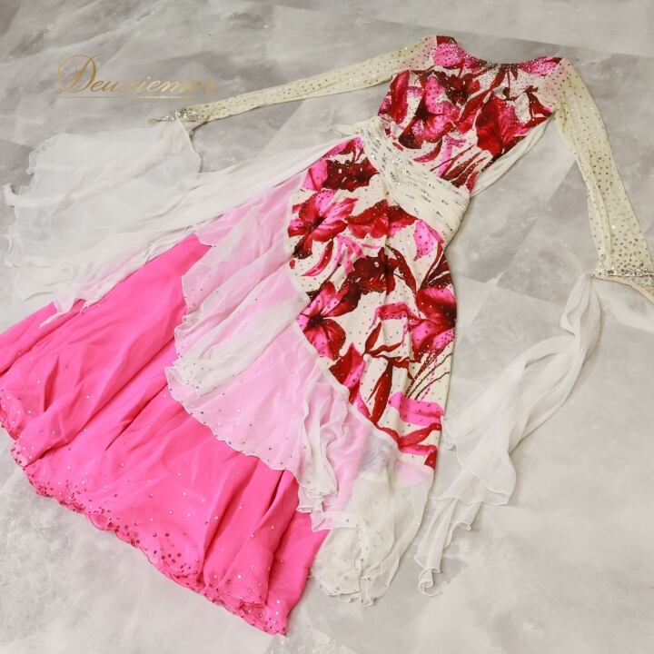社交ダンス 衣装 スタンダードドレス スタンダード ドレス ワンピース フロート ピンク 白 デモ 競技 花柄 ホワイト系 女性用 ドレス ピンク系 ホワイト系 おしゃれ スカート 落ち感 美しい 競技用 ダンス衣装 可愛い フェミニン 花柄デザイン 上品なデザイン 長袖 レディース ファッション 柔らかい素材