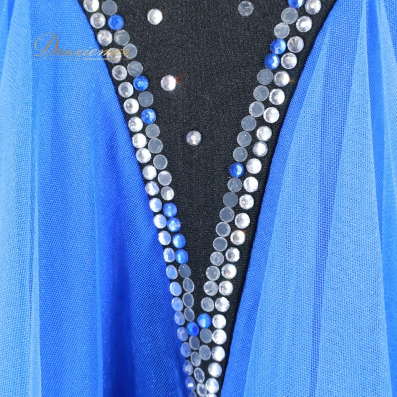 社交ダンス 衣装 スタンダードドレス スタンダード ドレス ワンピース パーティ デモ 青 競技 黒 ブラック ブルー系 発表会 クロッチ Wish plus パーティ衣装 ダンスドレス 発表会衣装 女性用ドレス スカート4枚 重ね 着やすい スタイリッシュ デザイン おしゃれ コスチューム 競技用ダンス