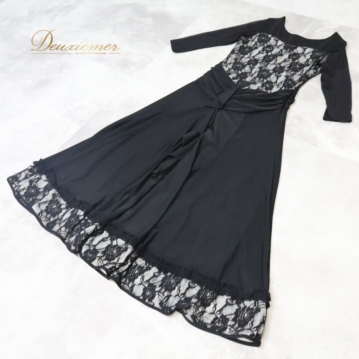 社交ダンス 衣装 スタンダード ドレス ワンピース パーティドレス パーティ 黒 レース 華やか 上品 綺麗 高級感 ブラック系 ホワイト 白 スカート ダンス衣装 エレガント ドレッシー 落ち着いた色合い おしゃれ フェミニン シンプル デザイン