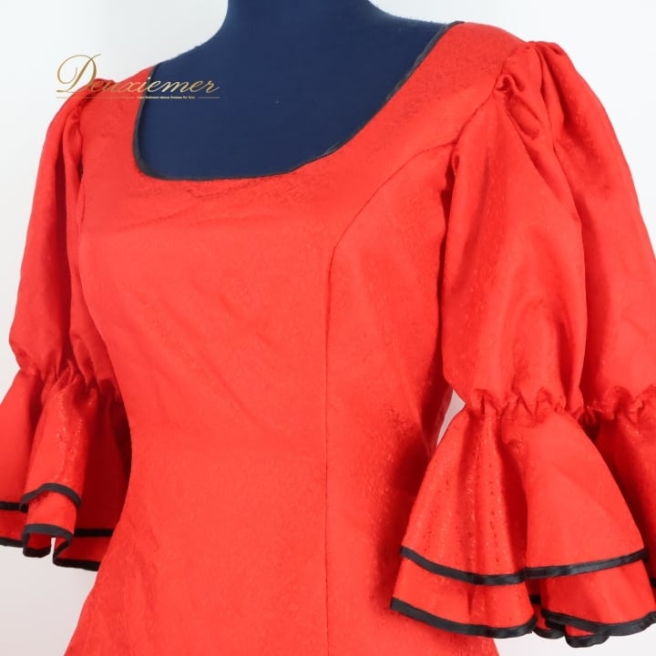#フラメンコ #衣装 #ドレス #ワンピース #赤色 #光沢感 #豪華 #大きな袖 #バレエ #パフォーマンス #舞台衣装 #トルソー #サイズ #背面ファスナー #肩パッド #華やか #ダンス衣装 #ステージ #カスタマイズ #ENUTSU