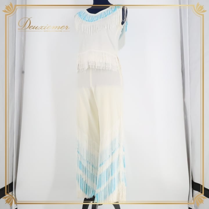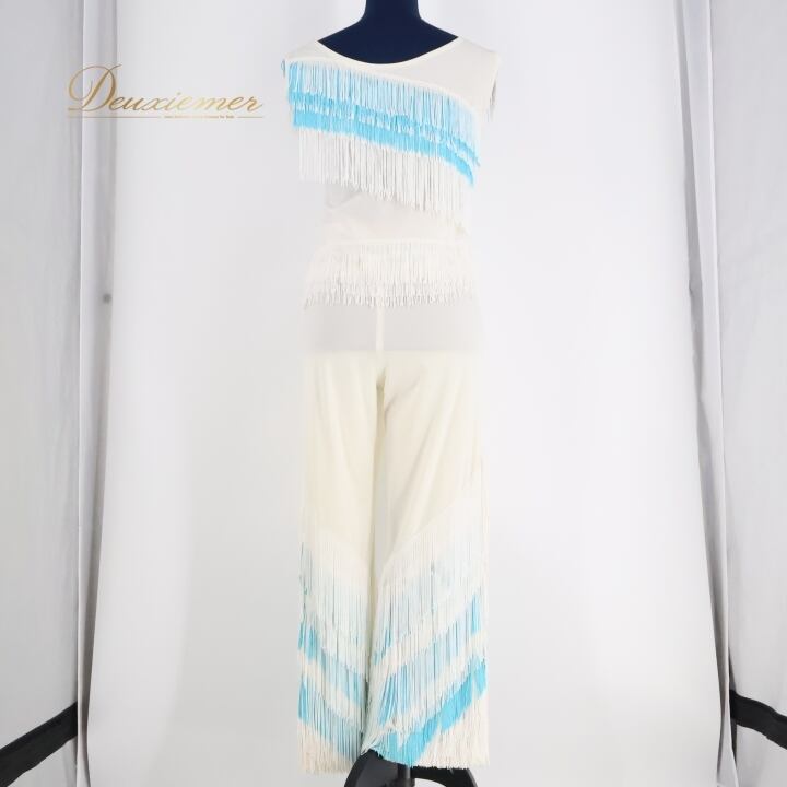 ダンス 衣装 トップス パンツ ズボン タンクトップ ノースリーブ ジャズ 社交ダンス パーティ 発表会 舞台 フリンジ ツーピース セットアップ 上下セット 水色 白 伸縮 ストレッチ ホワイト系 フリンジ付き おしゃれ 華やか 可愛い 軽やか 踊りやすい ステージ映え カジュアル イベント用 上下セパレート