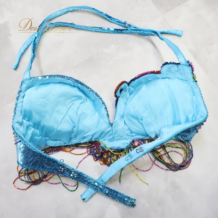 ベリーダンス オリエンタル 衣装 ベラ Bella 水色 ビーズ スパンコールラメ 装飾 花柄 レース 上下セット ブルー系 舞台 イベント スカート ドレス パーティー コスチューム パフォーマンス フェスティバル バルーンスリーブ エレガント