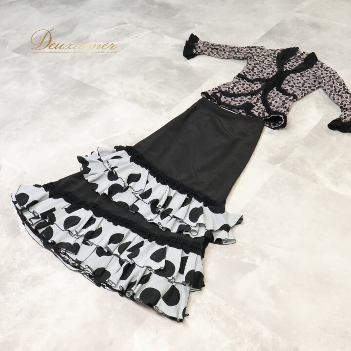 フラメンコ 衣装 ツーピース セットアップ 上下セット トップス ファルダ スカート 黒 白 紫 グレー ブラック系 LOPEZ DE SANTOS ロペスデサントス ボランテ フリル 水玉 ドット 上下セット 無地 エレガント カジュアル おしゃれ フラメンコ衣装 フェス パーティー ダンス衣装 舞台衣装 コスチューム レディース ドレス パフォーマンス 踊り かわいい コーディネート