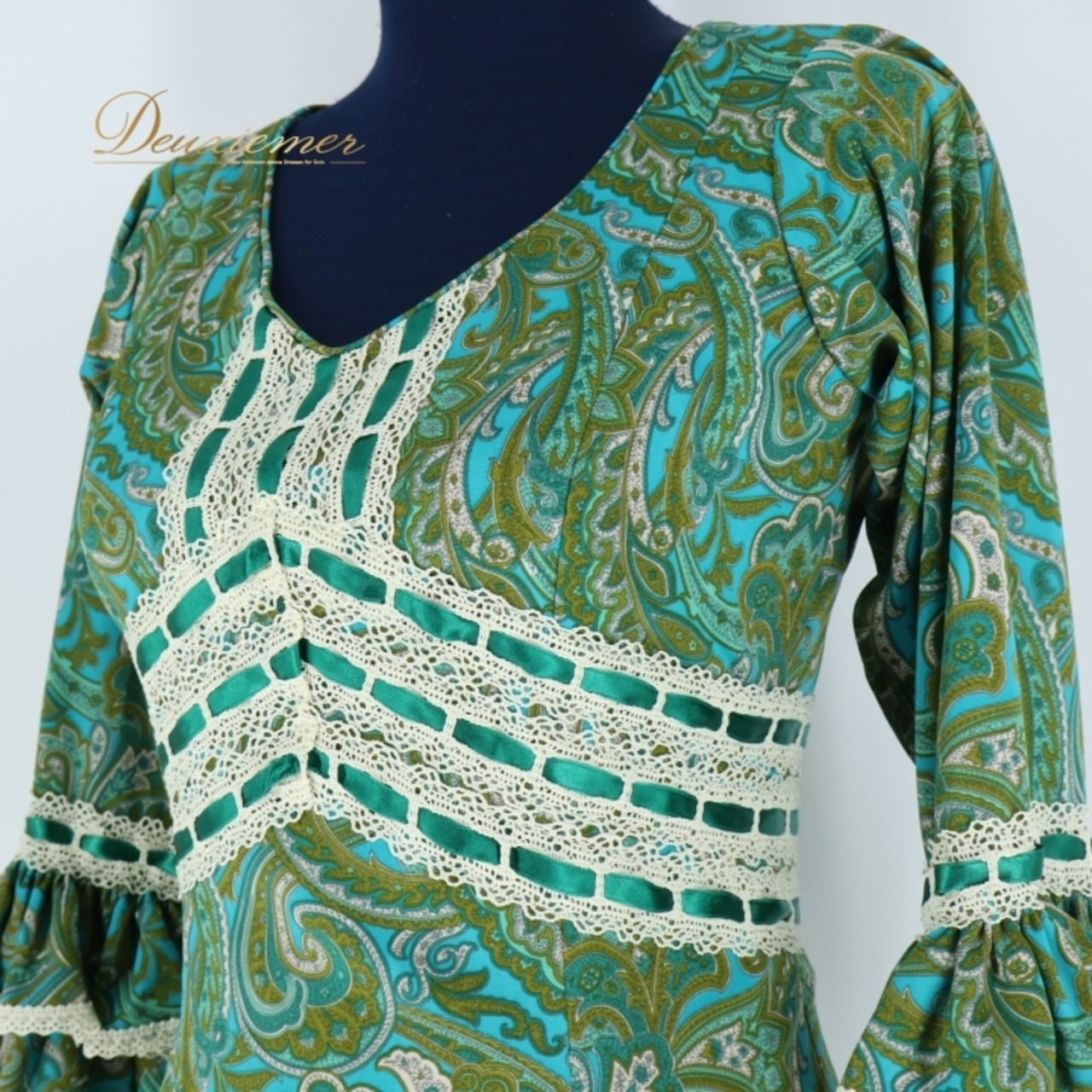 フラメンコ 衣装 ワンピース ドレス 緑 柄 ボランテ ペイズリー グリーン系 白 レース リボン フリル 発表会 パーティ ダンス 舞台 LOPEZ DE SANTOS ロペスデサントス 深緑 可愛い 美しい エレガント デザイン レディース おしゃれ お出かけ 上品 フリルデザイン