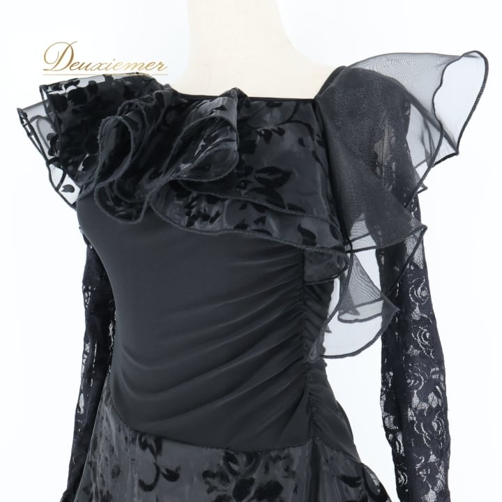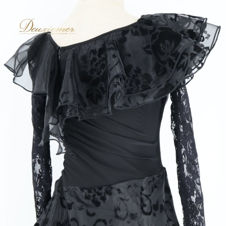 社交ダンス 衣装 スタンダード スタンダードドレス ワンピース 黒 パーティ 発表会 上品 高級感 フリル レース スウェード ブラック系 Leirena レイリーナ フリルデザイン スウェード生地 エレガント パフォーマンス 演出服 ドレスアップ ショー 衣装 シンプル 華やか