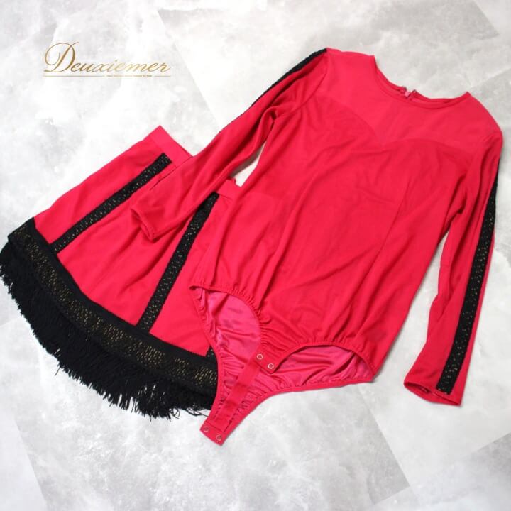 社交ダンス 衣装 ラテン ツーピース セットアップ レッスンウェア 練習着 ダンスパーティー レディー ス ブラック系 ピンク系 黒 SEKINE セキネ フリンジ レース 長袖 派手 バイカラー プリンセスライン ビビッドピンク 女性用 スカート ダンス用