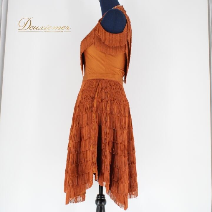 社交ダンス 衣装 チャコット Chacott ラテン ドレス ツーピース セットアップ スカート レオタード トップス フリンジ デモ 競技 パーティ 発表会 日本製 ブラウン系 茶色 フリンジ ドレス ラテンダンス 衣装 M スカート付き セットアップ スタイリッシュ 動きやすい 大人用 フォーマル おしゃれ 衣装用ドレス 競技会 パーティー用