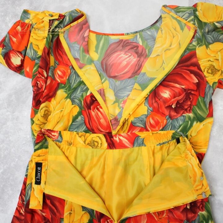 社交ダンス 衣装 チャコット Chacott トップス スカート ツーピース セットアップ 上下セット イエロー系 花柄 軽い 黄色 オレンジ 赤 パーティ 発表会 レトロ おしゃれ クラシック 発表会衣装 カラフル ステージ衣装 ダンス用