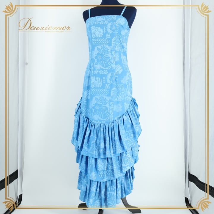 #フラダンス #衣装 #ワンピース #ドレス #ブルー #花柄 #フリル #ボリューム #スリット #背面ファスナー #ダンス衣装 #カパリリ #爽やか #女性用トルソー #ファッション #夏コーデ #パーティー #エレガント #カジュアル #ENUTSU