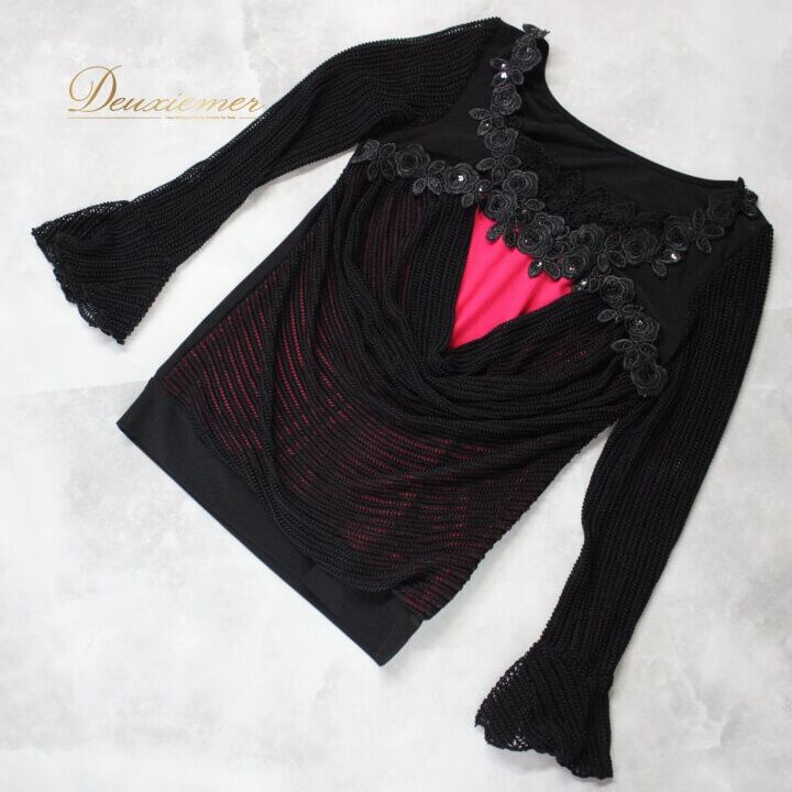 #社交ダンス #ダンス衣装 #ダンスファッション #トップス #ビビッドピンク #ブラック #スパンコール #花模様 #伸縮性 #アクティブウェア #ダンスパフォーマンス #フィットネス #トルソー #ウエア #スタイル #ファッション #ダンススタジオ #社交ダンス衣装 #パーティーコスチューム #ENUTSU