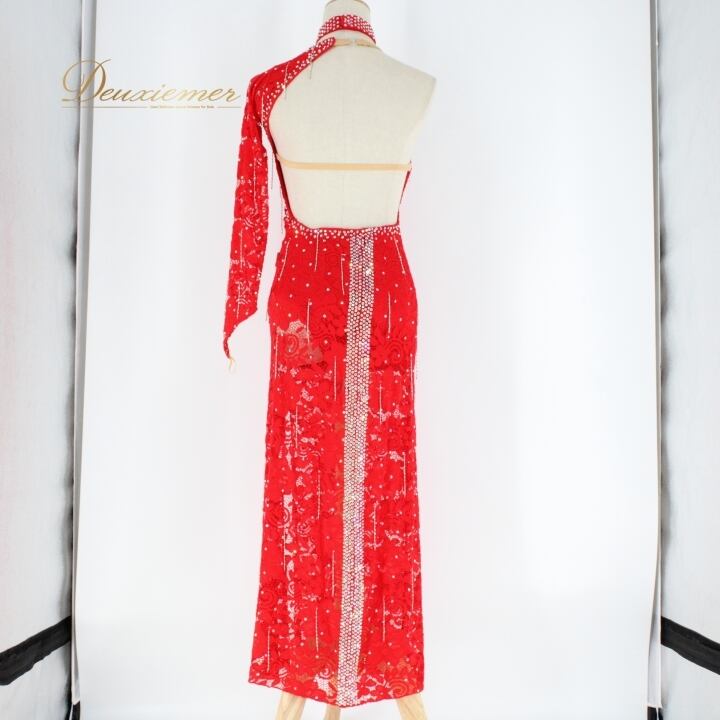 社交ダンス 衣装 ラテン ドレス ラテンドレス ワンピース NANAKA ナナカ 赤 デモ 競技 ダンス 舞台 パーティ レース お洒落 上品 高級感 レッド系 スリット 高級レース 美しい形 演技用 衣装用 フィット感 おしゃれなデザイン レディース パフォーマンス用