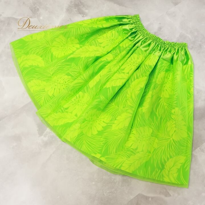 フラダンス 衣装 パウスカート グリーン系 フラ ダンス 黄緑 モンステラ柄 ハワイアン レッスン 練習 オーガンジー ハワイアンプリント ふんわり スカート 鮮やか 華やか 緑 明るい ①