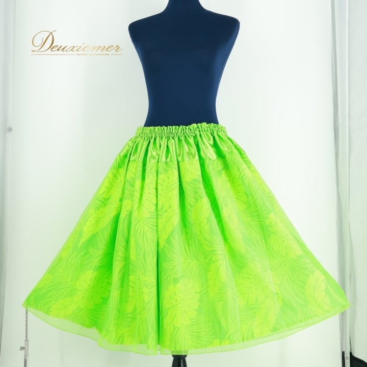 フラダンス 衣装 パウスカート グリーン系 フラ ダンス 黄緑 モンステラ柄 ハワイアン レッスン 練習 オーガンジー ハワイアンプリント ふんわり スカート 鮮やか 華やか 緑 明るい ②
