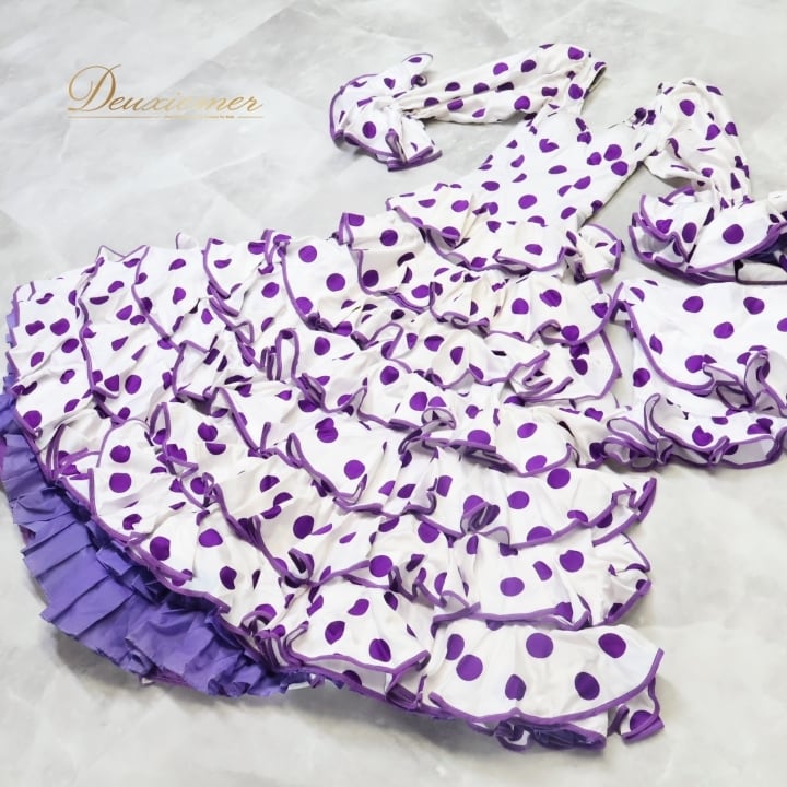 フラメンコ 衣装 ワンピース ドレス ボランテ 水玉 ドット 紫 白 フリル パーティ 発表会 ホワイト系 パープル系 スカート おしゃれ 可愛い ステージ コスチューム 大人用 パーティー