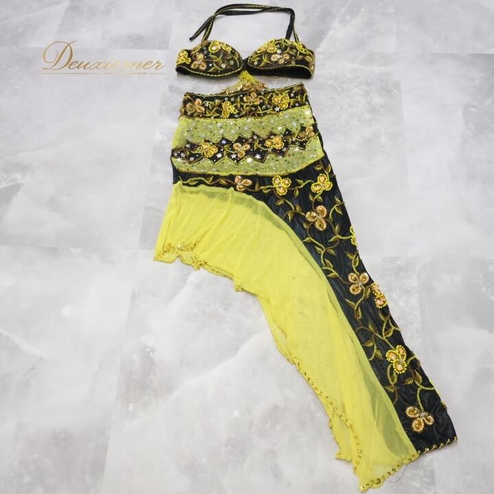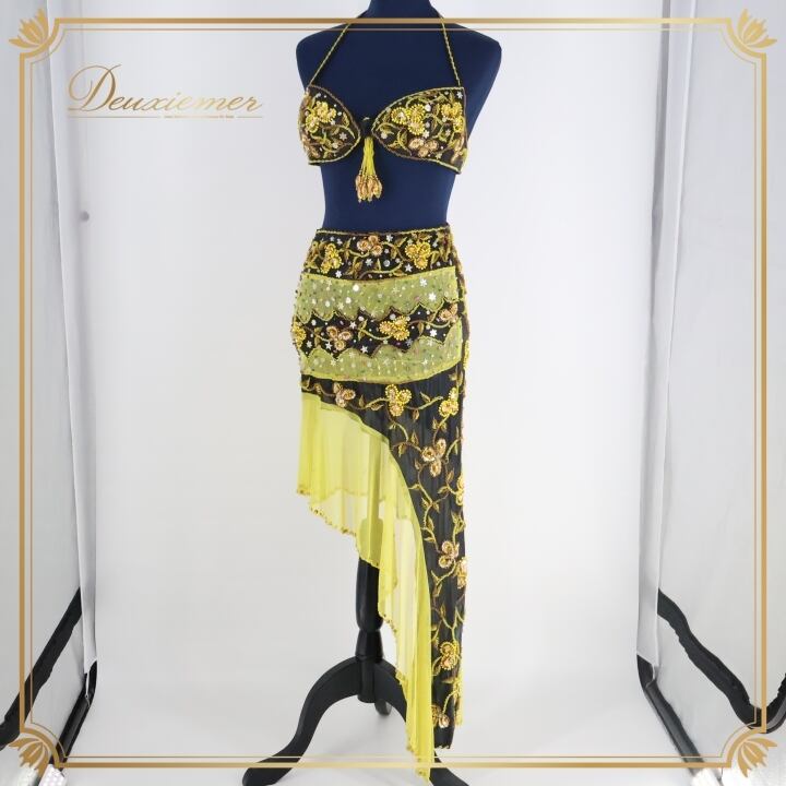 ベリーダンス オリエンタル 衣装 上下セット 黒 黄色 ゴールド 花柄 ラインストーン ビーズ イエロー系 ブラック系 発表会 舞台 イベント ダンス衣装 民族衣装 コスチューム レディース衣装 ステージ衣装 ゴールド装飾 ビーズ装飾 セットアップ セクシー