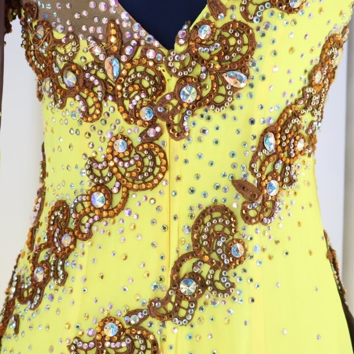 社交ダンス 衣装 スタンダードドレス スタンダード ワンピース ドレス デモ 競技 フロート 黄色 茶色 ブラウン系 レース イエロー系 おしゃれ ドレス 競技用衣装 社交ダンス衣装 スタンダード衣装 エレガント 可愛い ダンスパフォーマンス 大人用 おしゃれなデザイン