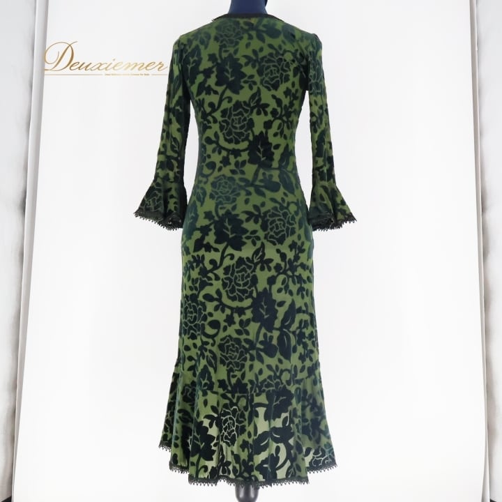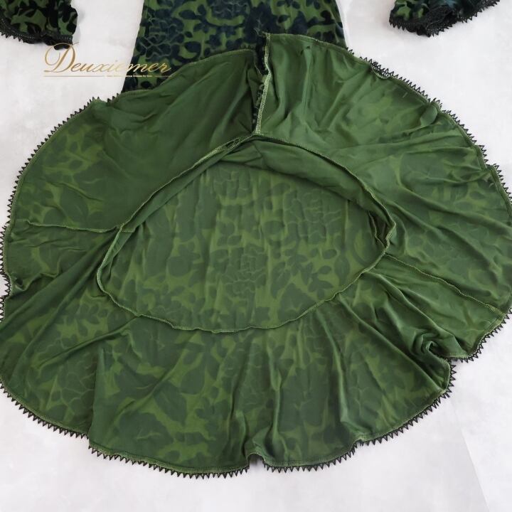 フラメンコ 衣装 ワンピース ドレス ベロア docedelflamenco ドセデルフラメンコ 緑 ミニ丈 ボランテ フリル 軽い 薄い 透け感 高級感 上品 モスグリーン カーキ グリーン系 高級 フラメンコドレス おしゃれ パーティー フェミニン 大人かわいい 透け生地 エレガント 軽やか ふんわり 伸縮性ストレッチ 模様 葉柄
