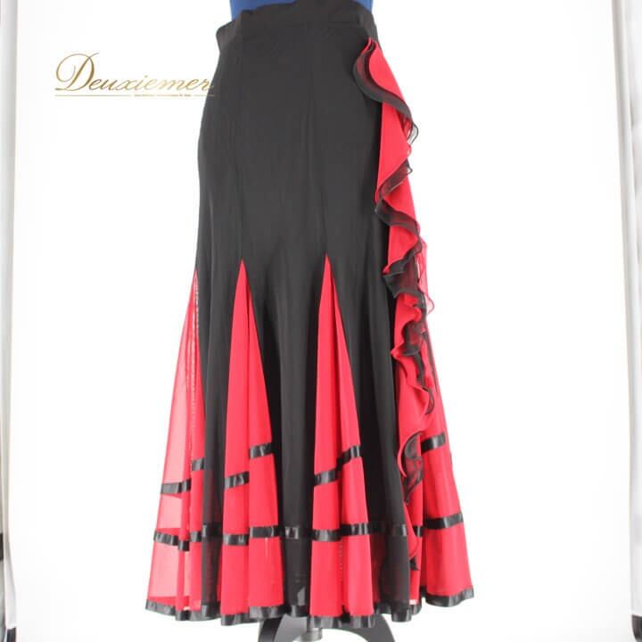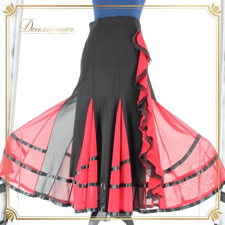 社交ダンス 衣装 スタンダード スカート レッスンウェア レディース オールシーズン ブラック系 レッド系 赤 黒 バイカラー レース 透け感 派手 フレア スカート デザイン ストレッチ リボン 大人用 ダンスウェア おしゃれ パーティー ウエストゴム