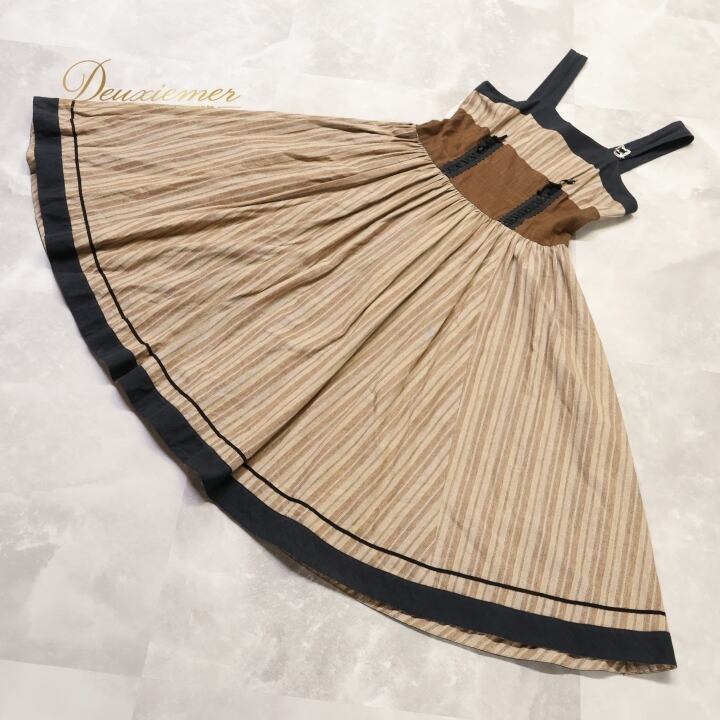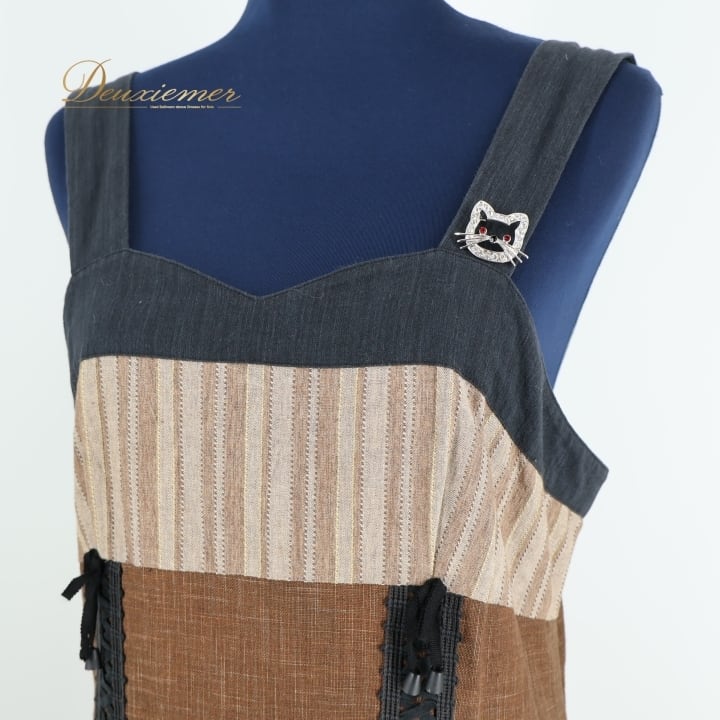 フォークダンス 衣装 ワンピース ドレス ブラウン系 パンドール ストライプ 茶 黒 明るい チロリアン レトロ カントリー 猫 Paondor かわいい 袖なし ベージュ系 ブラック系