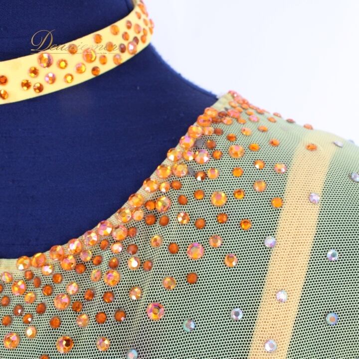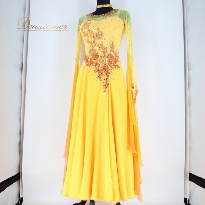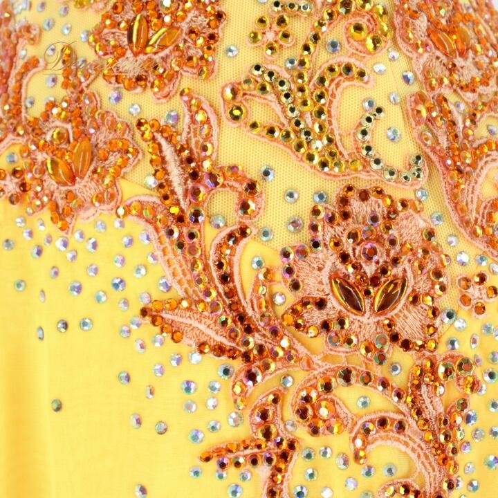 社交ダンス 衣装 スタンダード ドレス スタンダードドレス ワンピース 黄色 レース フロート デモ 競技 イエロー系 華やか スカート デザイン おしゃれ パーティー 競技会 ダンス衣装 イベント用 ステージ衣装 上品