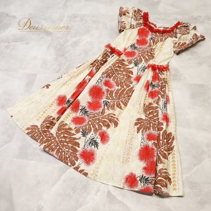 #フラダンス #衣装 #ワンピース #ドレス #ベージュ #ブラウン #レッド #ブラック #花柄 #フリル #華やか #ファッション #女性用 #トルソー #パーティー #イベント #夏 #舞台衣装 #コスチューム #オシャレ #ENUTSU