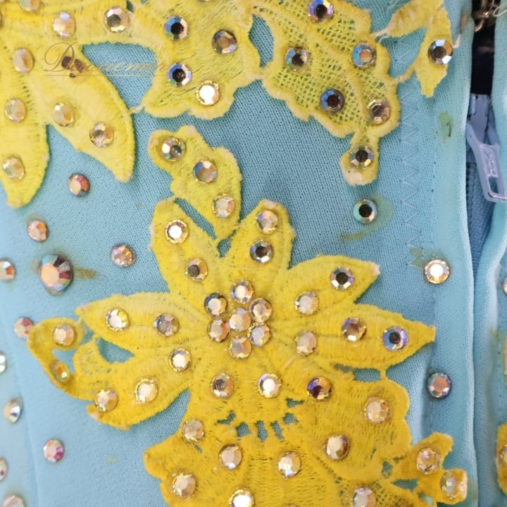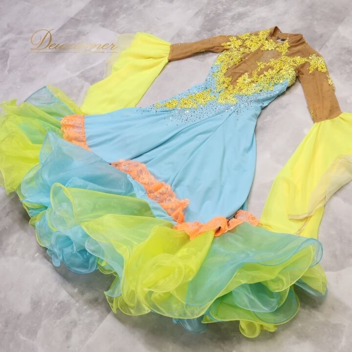 社交ダンス 衣装 スタンダード ドレス ワンピース 水色 黄色 フリル デモ 競技 パーティ 発表会 ブルー系 イエロー系 明るい色 元気なデザイン サイズ感 コスチューム おしゃれ 舞台衣装 ドレスアップ 競技用ダンス ステージ衣装 ドレッシー