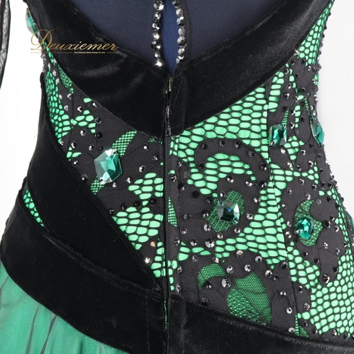 社交ダンス 衣装 スタンダード ドレス スタンダードドレス ワンピース ドレス デモ 競技 パーティ 発表会 緑 黒 ファー 豪華 上品 グリーン系 競技用ドレス デモ用ドレス フェミニンエレガント ダンスウェア ファー付きドレス ファー ダンスパフォーマンス