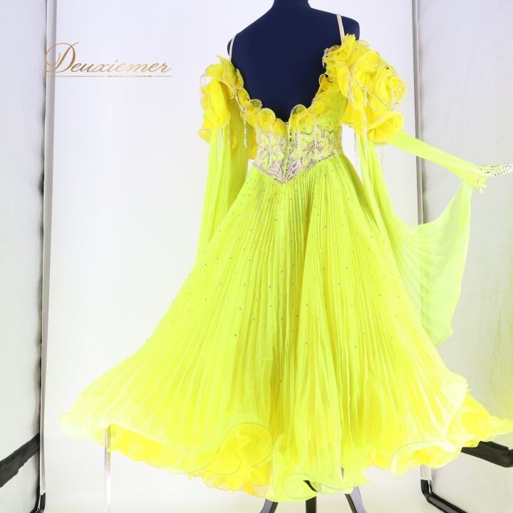 社交ダンス 衣装 スタンダード ドレス ワンピース スタンダードドレス 黄色 蛍光 フリル レース プリーツ イエロー系 蛍光色 華やか おしゃれ ドレスアップ 社交ダンス衣装 発表会 イベント用 フォーマル舞台用 コスチューム プリーツデザイン かわいい