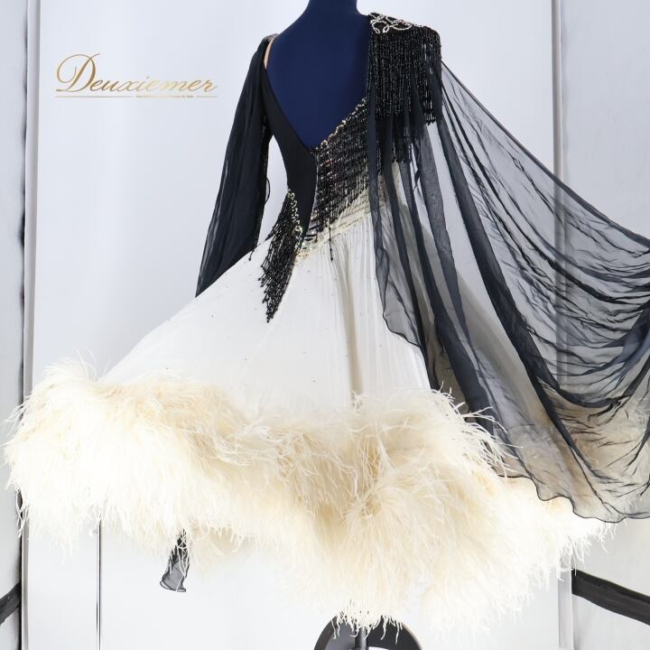 社交ダンス 衣装 スタンダード ドレス ワンピース 白 黒 ブラック系 ホワイト系 フロート ファー ボリューム デモ 競技用 ダンス 長袖 ボリュームスカート おしゃれ ふんわり揺れる エレガント ダンスウェア 競技用衣装 大人用