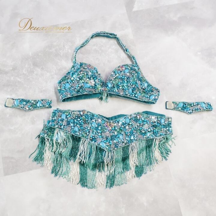 ベリーダンス オリエンタル 衣装 セット ブルー系 グリーン系 シルバー系 エメラルドグリーン ラインストーン ビーズ 装飾 発表会 舞台 イベント 豪華 重量感 トップス ベルト アクセサリー コスチューム ダンス衣装 オリエンタルスタイル レディース衣装