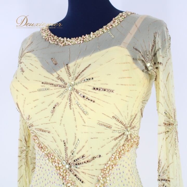 社交ダンス 衣装 スタンダードドレス スタンダード ワンピース 黄色 ファー デモ 競技用 ダンス パーティ 発表会 イエロー系 レモン 明るい 明るい色 明るいレモン色 デモ用 競技用ドレス コスチューム 発表会用