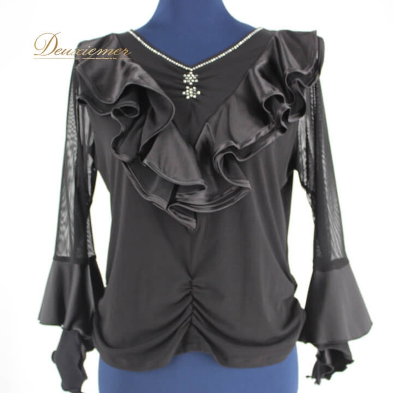 社交ダンス 衣装 スタンダード トップス レッスンウェア レディース オールシーズン 黒 ACROSS ブラック系 ラインストーン 長袖 フリル レース ポリエステル ポリウレタン 伸縮性あり クラシック スタイリッシュ 華やか コンフォート おしゃれ