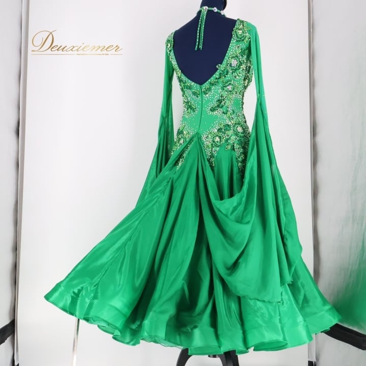 社交ダンス 衣装 スタンダード ドレス ワンピース スタンダードドレス 緑 フロート レース フリル グリーン系 デモ 競技用 ダンス パーティ 発表会 ふんわり スカート 光沢感 おしゃれ ダンス衣装 競技用ドレス レディース フォーマル ステージ衣装