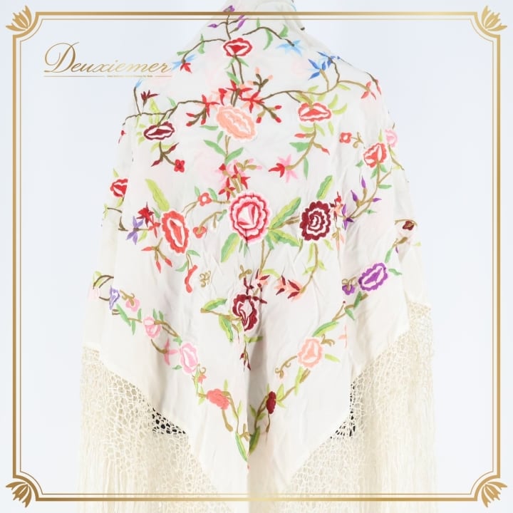 フラメンコ 衣装 マントン シージョ スクエア 四角 フレコ 刺繍 花柄 小物 フリンジ 白 ホワイト系 フェミニン おしゃれ 大人 かわいい エレガント ファッション ダンス 衣装 イベント 多彩な刺繍 長いフレコ デザイン