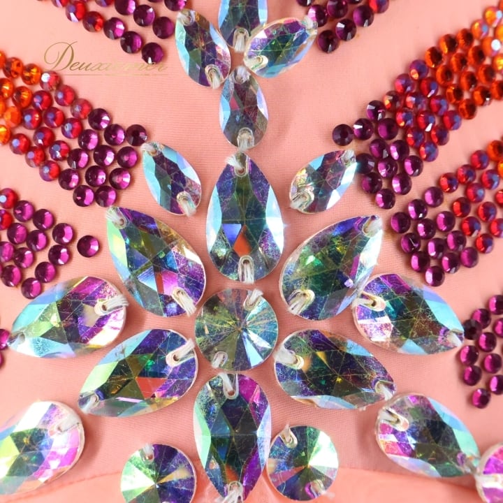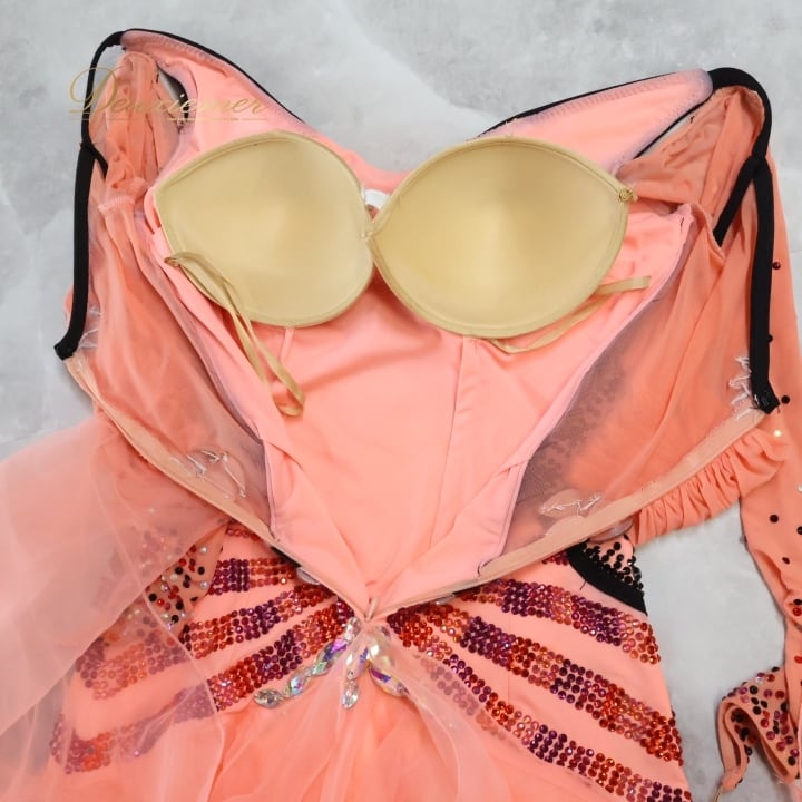 社交ダンス 衣装 スタンダード ドレス スタンダードドレス ワンピース フロート デモ 競技 ダンス フリル レース ピンク系 オレンジ系 かわいい デザイン 女性らしい 明るい スカート ふんわり おしゃれ パーティー ドレスアップ 競技用 女性 Mサイズ
