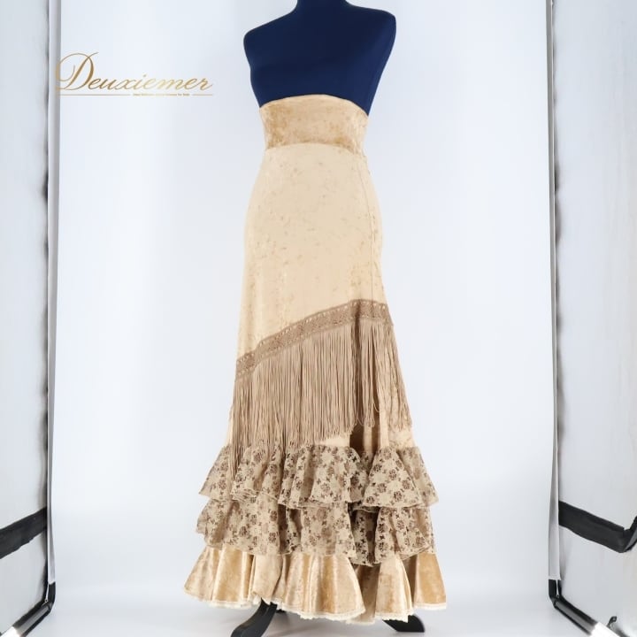 フラメンコ 衣装 ファルダ シージョ スカート ベロア フレコ ボランテ フリル レース Alcala 高級感 ハイウエスト ゴールド系 金 高級 フラメンコスカート スタイリッシュ エレガント イベント ダンス 衣装 ステージ衣装 舞台衣装 おしゃれ かわいい