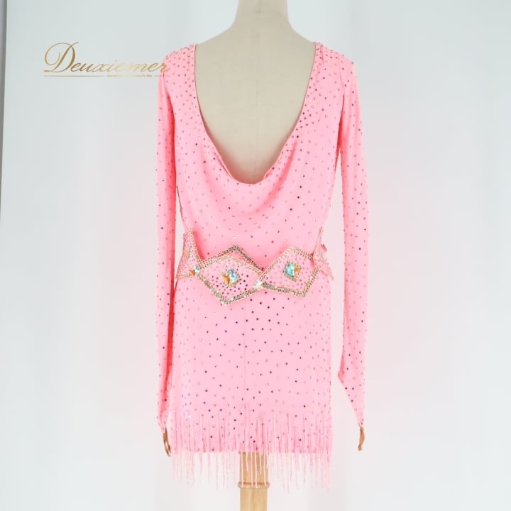 社交ダンス 衣装 ラテン ドレス ワンピース ピンク系 長袖 デモ 競技 ダンス パーティ 発表会 ミニ丈 ビーズ 明るいピンク 華やかビーズ ゆれる裾 おしゃれ デモ用 エレガント パーティー服 ショートドレス ダンス衣装 競技用 レディース ストレッチ かわいい デザイン
