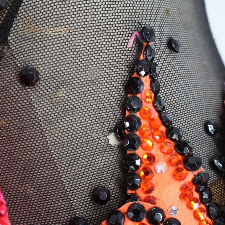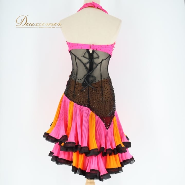 社交ダンス 衣装 ラテン ドレス ワンピース ラテンドレス フリル レース デモ 競技用 ダンス パーティ 蛍光 ピンク系 オレンジ系 可愛い おしゃれ スカート ひだ 競技用衣装 デザイン ダンス衣装 ラテンダンス 衣装 レディース パーティードレス 蛍光色 目立つ