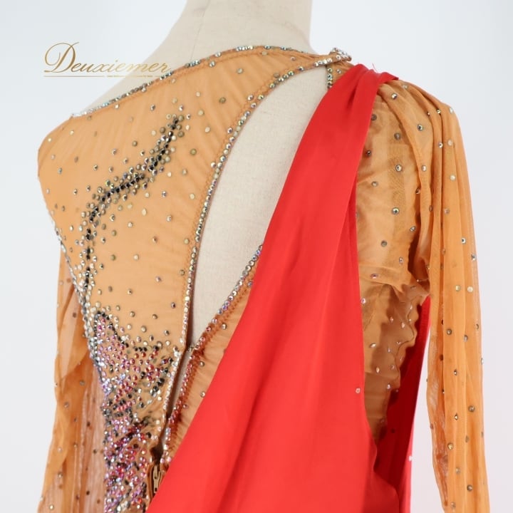 社交ダンス 衣装 ラテン ドレス ワンピース ラテンドレス 赤 ブラウン デモ 競技 ダンス パーティ ベージュ 茶色 レッド系 おしゃれな形 揺れる裾 競技用ダンス ドレスデザイン ダンスウエア 衣装用ドレス レディースドレス パーティー